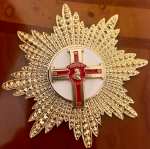 I Cavalieri di Gran Croce d’Oro portano la Croce dell’Ordine rossa caricata da una placca filigranata in argento a raggi uscenti, il tutto pendente da una fascia rossa.
